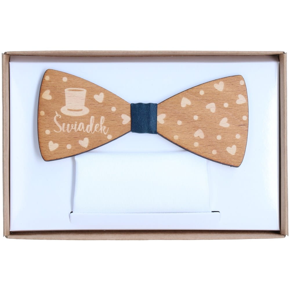 Stylowa i oryginalna drewniana muszka z napisem „Świadek” i serduszkami to wyjątkowy dodatek ślubny, który podkreśli rangę tej ważnej roli. Wykonana z naturalnego drewna i ozdobiona trwałym nadrukiem UV, łączy elegancję z nowoczesnym designem.