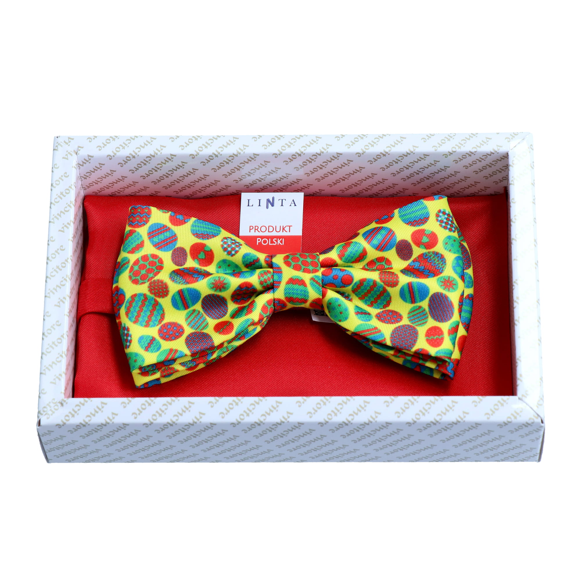 Elegancka mucha o oryginalnym kształcie motyla z motywem kolorowych pisanek. Poszetka czerwona.