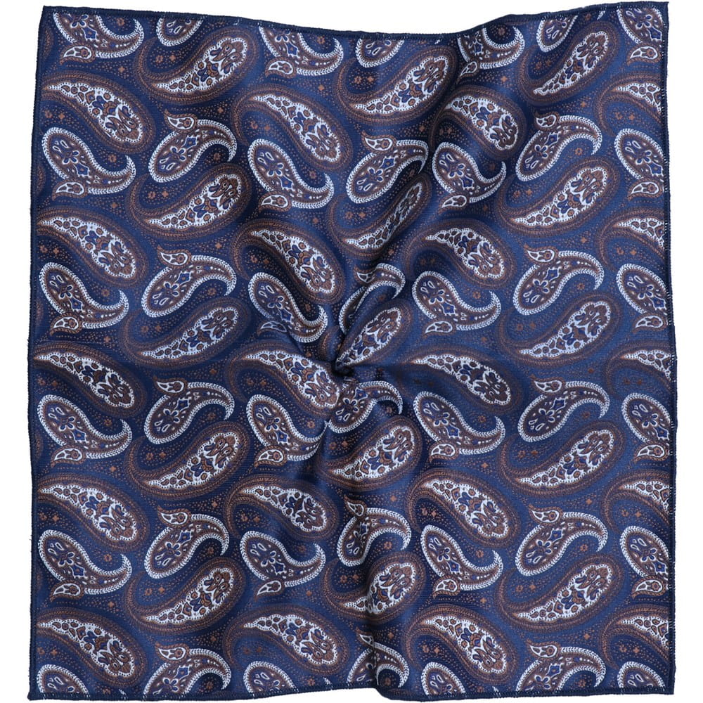 Stylowa poszetka wykonana z wysokiej jakości poliestru, ozdobiona pięknym wzorem Paisley na granatowym tle.
