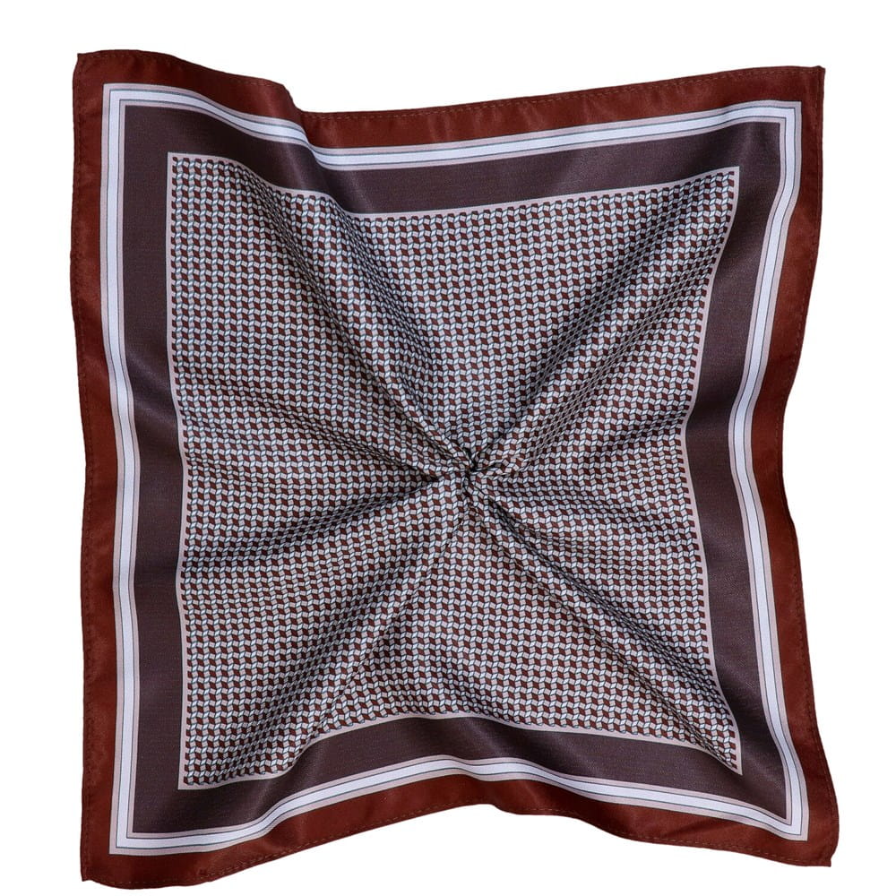 Stylowa poszetka wykonana z wysokiej jakości poliestru, ozdobiona białymi mikro-wzorami na brązowym tle.