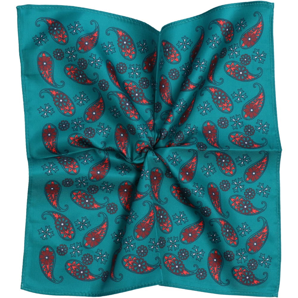 Stylowa poszetka wykonana z wysokiej jakości poliestru, ozdobiona pięknymi czerwonymi wzorami Paisley na zielonym tle.