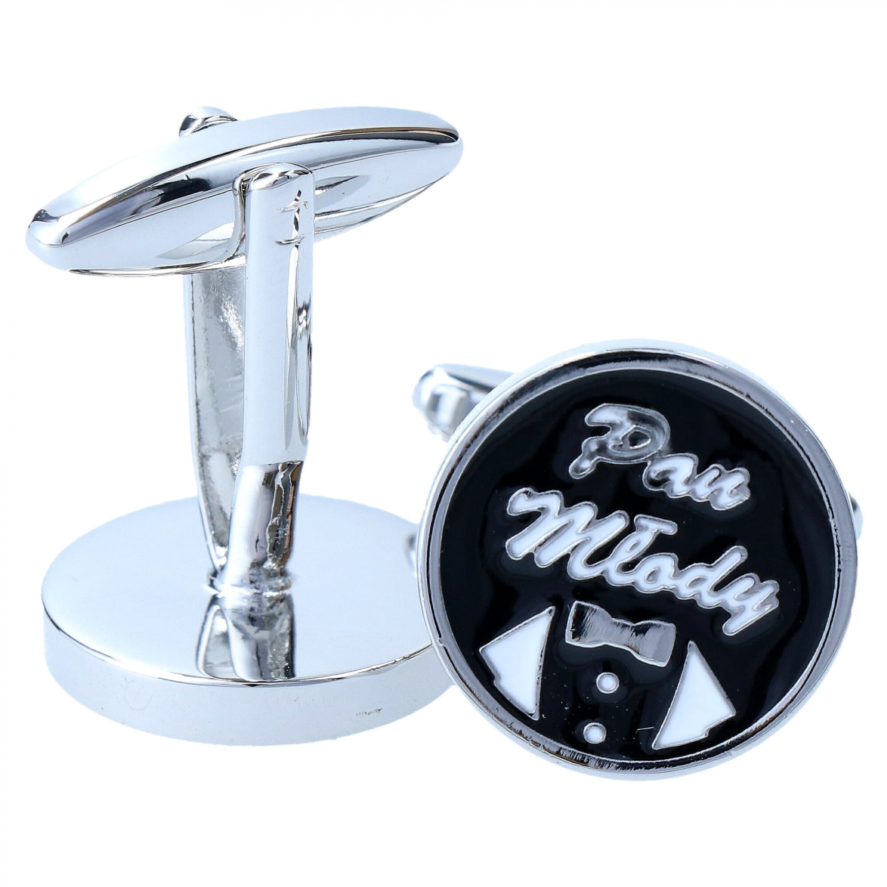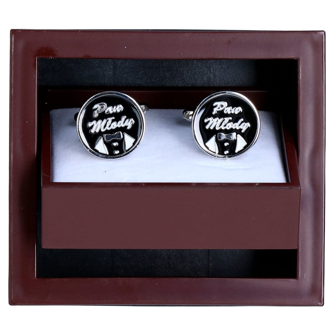Spinki do mankietów w kształcie kół w kolorze czarnym i motywem pan młody są wyjątkowym dodatkiem do ślubnej stylizacji. Kolor i motyw spinek jest uniwersalny i pasuje do wszystkich garniturów.