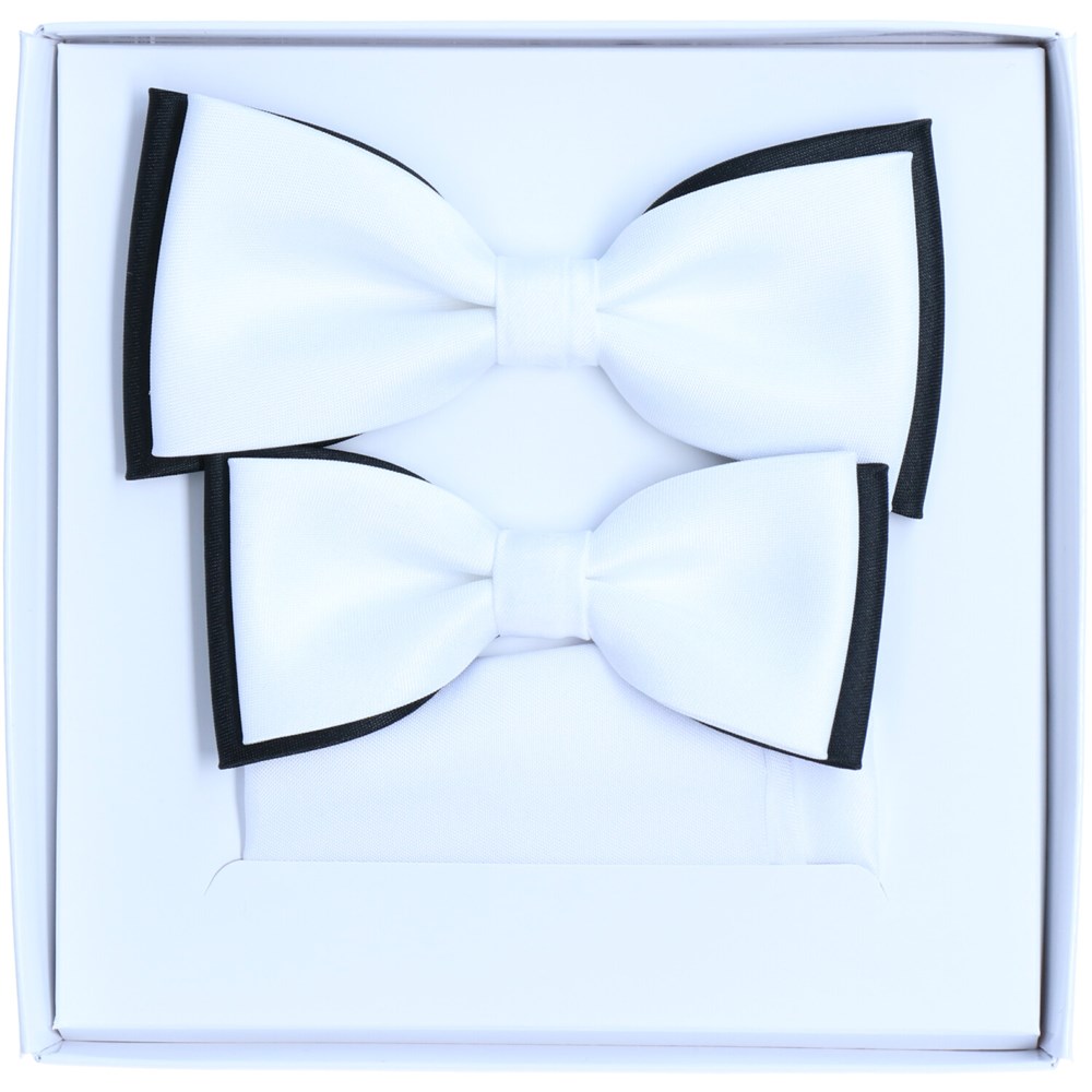 Biały komplet much dla taty i syna z czarną lamówką – elegancki zestaw na komunię i uroczystości