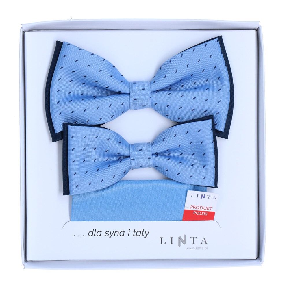 W zestawie znajduje się muszka męska oraz muszka dziecięca, dzięki czemu tata i syn mogą stworzyć spójny, dopracowany look na ważne uroczystości i wspólne zdjęcia.